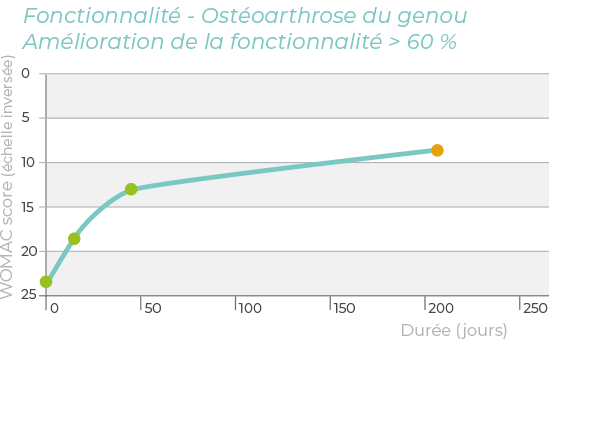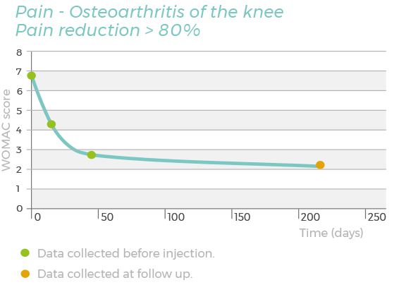 À ce jour, les résultats cliniques recueillis sur plus de 100 patients souffrant d’ostéoarthrose du genou montrent l’efficacité clinique de CHondroGrid® dans la réduction de la douleur et la récupération fonctionnelle avec un suivi de plus de 6 mois après la dernière injection.