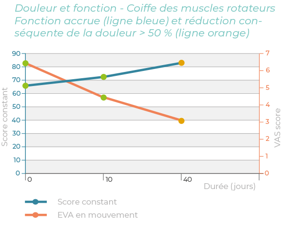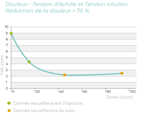 Les résultats préliminaires de 2 études cliniques, l’une sur des patients atteints d’une affection du tendon rotulien et du tendon d’Achille (graphique de gauche) et l’autre sur des patients atteints d’une tendinopathie de la coiffe des muscles rotateurs (graphique de droite), montrent que CHondroGrid® réduit la douleur et favorise la récupération fonctionnelle.